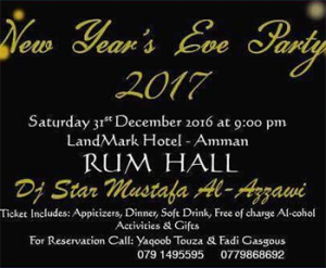 Join us for the countdown to 2017 NYE DJ Party 2017 @ Rum Hall, Landmark Hotel Amman On Saturday 31/12/2016, at 9:00 pm onward with DJ Mustafa Al-Azawi Food, fun, activities & gifts For reservation or for more information please call: 0791495595 - 0779868692
