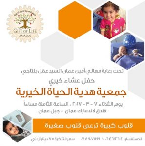 تحت رعاية معالي امين عمان السيد عقل بلتاجي تحتفل جمعية هدية الحياة هذا العام بمرور عشر سنوات على تأسيسها وبهذه المناسبة، تقيم الجمعيه تحت رعاية معالي عقل بلتاجي الأكرم حفل عشاء خيري لجمع التبرعات لمعالجة الأطفال الأقل حظا" الذين يولدون بعيب خلقي في القلب " قلوب كبيرة ترعى قلوب صغيرة" Under the patronage of His Excellency Mr. Aqel Biltaji / Mayor of Amman, Jordan GIFT of LIFE Amman (GOLA) celebrates its10th Anniversary with a GALA Dinner to help fundraise further …