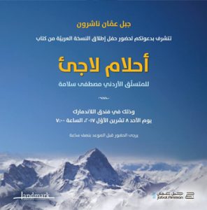 تتشرف جبل عمان ناشرون بدعوتكم لحضور حفل إطلاق النسخة العربيّة من كتاب أحلام لاجئ: من الشرق الأوسط إلى قمّة إفرست للمتسلّق الأردني مصطفى سلامة وذلك في فندق اللاندمارك يوم الأحد 8 تشرين الأول 2017، الساعة 7 مساءًا يرجى الحضور قبل نصف ساعة الدعوة عامّة