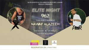 #Elite_Events In Collebertion With #Sky_Lounge Presents: ELITE NIGHT 962 Date: 16.03 Thursday Location: SKY Lounge Music by: DJ X DJ PitchR The Percussionist : Nawaf Alazeeh Music: Hip hop & RnB , commercial , deep house , house And More ... ------------------ Couples And Mixed Group Only !!! Entrance : 10 JD ♛ Reservations & Guestlist only ♛ 079 0577 680 - 0791978528 For Guest List: Elite.events.jordan@gmail.com Powered by: Elite-Events