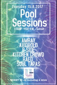 TUESDAY IS A HOLIDAY so what better way to celebrate a hot summer's day than a fantastic daytime pool session with 6 of Amman's favorite dj's. Join us tomorrow from 11:00 a.m. onwards for some serious fun in the sun featuring this stellar line up: AMRAY AVIDBOLD B-SIDE KITCHEN CROWD RAED SOUL TAPAS Entrance JD 15.00 including a drink To reserve call Reservation Mandatory See you at U Roof Lounge Sip, Savour, Socialize