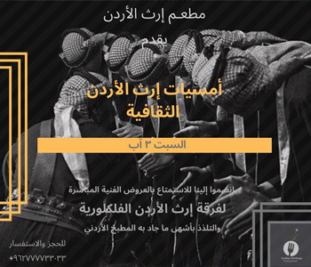 يسر مطعم إرث الأردن دعوتكم لحضور فعاليات ( أمسيات إرث الأردن الثقافية )، حيث نأخذكم في جولة تشعل حواسكم الخمسة عبر إرثنا الوطني بعروض فنية وموسيقية بمشاركة من فرقة إرث الأردن الفلكلورية وعدد من الموسيقيين وعروض الرسم بالحناء مع المبدعة بلقيس العبادي، مع الاستمتاع بأشهر وألذ منتجات مطبخنا الأردني.