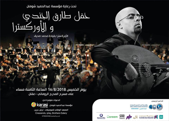 بدعم من مؤسسة عبدالحميد شومان، أمسية موسيقية للموسيقي وعازف العود الأردني طارق الجندي بمصاحبة الأوركسترا الوطنية على المدرج الروماني-عمّان، بقيادة محمد عثمان صديق، تتضمن مقطوعات من تأليف الجندي ستقدم لأول مرة بتوزيع خاص للأوركسترا.