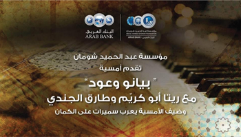 ضمن أمسياتها الموسيقية، تُقيم مؤسسة عبد الحميد شومان أمسية بعنوان “بيانو وعود” مع ريتا أبو كريّم وطارق الجندي، وضيف الأمسية يعرب سميرات على الكمان، وذلك يوم الخميس 31 تشرين الأول 2019 الساعة 7:30 مساءً في مقر مؤسسة عبد الحميد شومان- جبل عمان.