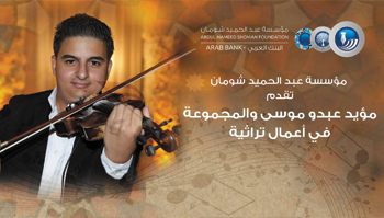 ضمن أمسياتها الموسيقية، تُقدم مؤسسة عبد الحميد شومان عازف الكمان مؤيد عبدو موسى والمجموعة في أعمال تراثية، وذلك في مقر المؤسسة – جبل عمان، يوم الخميس 24 آب 2017، الساعة 7:30 مساء.