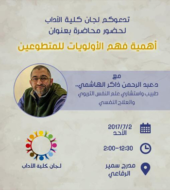 تدعوكم لجان الآداب لمحاضرة “أهمية فهم الأولويات للمتطوعين” مع الدكتور عبدالرحمن ذاكر الهاشمي بالإضافة للعديد من المسابقات والجوائزانتظاركم يوم الأحد آملين تحقيق الفائدة والتسلية?