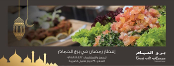 عيش الأجواء الرمضانية مع العائلة و الأحبة و تناول طعام الإفطار في تراس برج الحمام ..أطيب و أشهى المأكولات العربية و العالمية و الحلويات الرمضانية الخاصة مع أجواء الموسيقى العربية و فرقة للطرب الأصيل يوميا” خلال الشهر الفضيل.