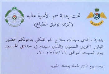 يتشرف نادي سيدات سلاح الجو بدعوتكم لحضور البازار الخيري السنوي و الذي سيقام في حدائق الحسين