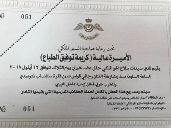 يقيم نادي سيدات سلاح الجو الملكي الأردني حفل عشاء خيري على بركة قيادة سلاح الجو الملكي الأردني يوم الثلاثاء الموافق 12 ايلول 2017 الساعة السابعة مساء