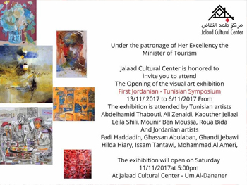 برعاية وزيرة السياحة الاردنية يقام المعرض التونسي – الاردني الأول للفنون البصرية ، ويستمر المعرض لمدة سبعة ايام حيث تنطللق باكورة اعماله يوم 6/11/2017 والافتتاح الرسمي يوم 11/11/2017 وتنتهي أعماله يوم 13/11/2017.