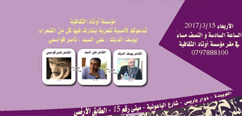 في أمسية شعرية يوم الأربعاء 15/3/2017 الساعة السادسة و النصف مساء في مقر المؤسسة ، اللويبدة – دوار باريس – شارع الباعونية – مبنى رقم15 – الطابق الأرضي
