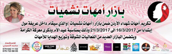شاركونا في أضخم بازار بعيد الأم بازار(أمهات نشميات )والذي سيقام في عريفة مول ابتداءا من تاريخ 16/3/2017 لغاية 21/3/2017 سيتخلل البازار حفل تكريم لأمهات الشهداء وتوزيع هدايا للأمهات والعديد من الفعاليات والأنشطة المشوقة …..الدعوة عامة للأستفسار 0796421162