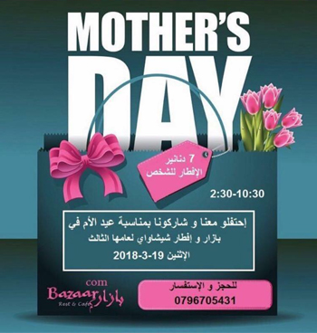 احتفلوا معنا وشاركونا بمناسبة عيد الأم في بازار وإفطار شيشاواي لعامها الثالث