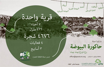 ضمن حملة القافلة الخضراء تنظم العربية لحماية الطبيعة بالتعاون مع مؤسسة ابداع – البلقاء حملة لزراعة المسطحات الخالية في كل بيوت قرية البيوضة. و تهدف المبادرة الى تعزيز السيادة الغذائية و خلق نموذج للقرى الأردنية الخضراء المنتجة . و قد قام متطوعين من أهالي القرية بإجراء مسح ميداني شامل للبيوت يكشف امكانية زراعة الأشجار و نوعها و توفر مصادر المياه و نية العائلة العناية بها. و بعد اجراء المسح كان عدد الأشجارالمثمرة المطلوبة 4676 في 426 منزل في الاحياء التالية : الحقاوة و اليعقوب و النعيم و الرواق و البيوضة الغربية و البيوضة الشمالية و الحارة الوسطى .