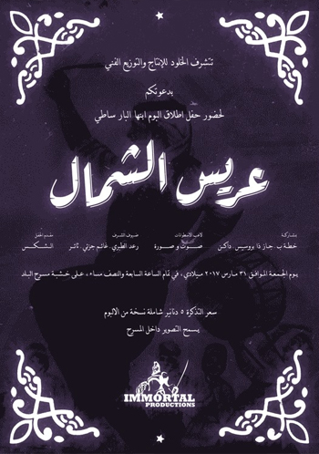 تتشرف الخلود للإنتاج والتوزيع الفني Immortal Entertainment بدعوتكم لحضور حفل إطلاق البوم “عريس الشمال” SATTI – ساطي على خشبة مسرح البلد الموافق ٣١\٣\٢٠١٧ في تمام الساعة الثامنة مساءاً.