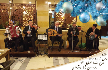 حفلة رأس السنة 2017 في الصالة الدمشقية فرع خلدا -الطابق الاول حفل فني ساهر يتخلله بوفية عشاء فاخر على أنغام المطرب الفنان أيمن سماوي وفرقتة الموسيقية سعر البطاقة 30 دينار شامل الضريبة
