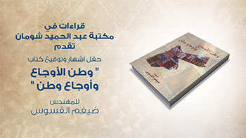 تستضيف مكتبة مؤسسة عبد الحميد شومان العامة ضمن برنامج قراءات في المكتبة، حفل إشهار وتوقيع كتاب “وطن الأوجاع وأوجاع وطن” للمهندس ضيغم القسوس، يوم الأربعاء 22/2/2017 الساعة 6:30 مساءً، في قاعة مكتبة عبد الحميد شومان – الطابق الأول. تقديم الدكتورة ابتسام القسوس