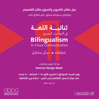 تدعوكم جبل عمان ناشرون وأسبوع عمان للتصميم لحفل إطلاق كتاب: ثنائيّة اللغة في التواصل البصري Bilingualism in Visual Communication لمؤلفته ديان مخايل.