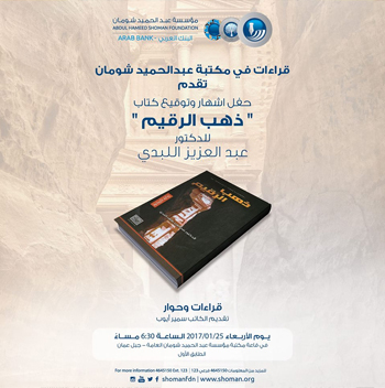 تستضيف مكتبة مؤسسة عبد الحميد شومان العامة ضمن برنامج قراءات في المكتبة، حفل اشهار وتوقيع كتاب “ذهب الرقيم” للدكتور عبد العزيز اللبدي، يوم الأربعاء 25/1/2017 الساعة 6:30 مساءً، في قاعة مكتبة عبد الحميد شومان – الطابق الأول. تقديم الكاتب سيمر أيوب.