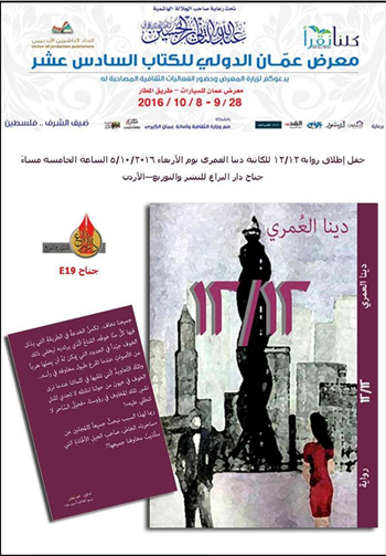 سيتم إطلاق وإقامة حفل توقيع رواية 12/12 للكاتبة دينا العمري في معرض عمان الدولي للكتاب 2016، في جناح دار اليراع للنشر والتوزيع، رقم الجناح E19، وذلك في 5/10/2016 في تمام الساعة الخامسة مساء.