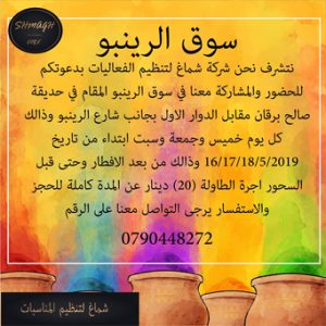 نتشرف بدعوتكم للحضور والمشاركة معنا في بازار سوق شارع الرينبو ودالك كل يوم خميس وجمعة وسبت ابتداء من تاريخ 16/17/18/5/2019 من بعد وقت الافطار وحتى قبل فترة السحور يتضمن السوق عرض لمنتجات عضوية وحرفية وفنية يقوم عليها نخبة من الايدي الماهرة الاردنية نتشرف بحضوركم للحجز او الاستفسار تواصلوا معنا على الرقم 0790448272