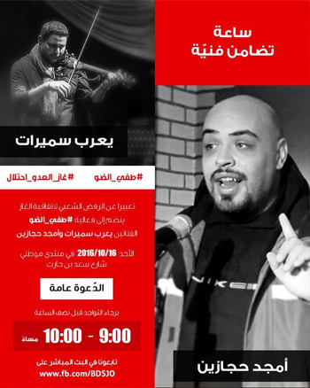 تدعوكم حركة الأردن تقاطع ومنتدى موطني لحضور أمسية تضامن فنية مع حملة طفي الضو الشعبية. الدعوة عامة.