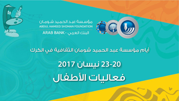 ضمن فعاليات أيام مؤسسة عبد الحميد شومان الثقافية في الكرك، تنظم المؤسسة خلال الأيام الثقافية ابتداءً من يوم الخميس 20/4/2017 الى يوم الأحد 23/4/2017 فعاليات للأطفال يقدمها فريق مكتبة “درب المعرفة” للأطفال واليافعين.