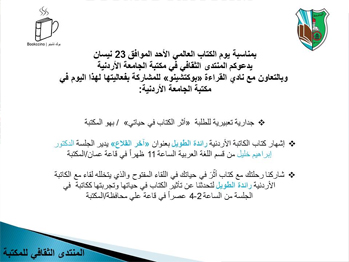 وبالتعاون مع نادي القراءة «بوكتشينو» للمشاركة بفعاليتها لهذا اليوم في مكتبة الجامعة الأردنية: