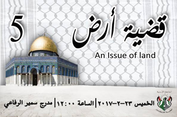ندعوكم نحن الطلبة الفلسطينيين لحدث (قضية ارض)، وذلك يوم الخميس الموافق 23/2/2017 ، في تمام الساعة الثانية عشرة ظهراً في مدرج سمير الرفاعي..
