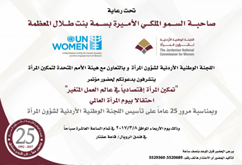 اللجنة الوطنية الأردنية لشؤون المرأة وبالتعاون مع هيئة الأمم المتحدة لتمكين المرأة تعقد مؤتمرا بعنوان “تمكين المرأة اقتصاديا في عالم العمل المتغير” وذلك بمناسبة يوم المرأة العالمي2017 واحتفالا بمرور 25 عاما على تأسيس اللجنة الوطنية وذلك يوم الأربعاء الموافق 2017/3/8 الساعة العاشرة صباحا ولغاية الثالثة والنصف في فندق الرويال /قاعة عشتار