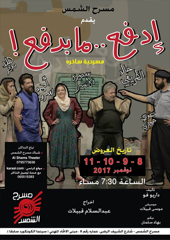 يقيم مسرح الشمس العرض الاول لمسرحية ” إدفع.. ما بدفع! ” الساخرة الاربعاء الموافق 8/11/2017 الساعة السابعة والنصف ,وهو عرض افتتاح لمسرح الشمس تتلوه عروض اخرى بتاريخ 9/10/11 نوفمبر …