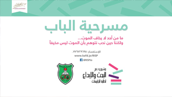 يشرفنا دعوتكم لحضور العرض المسرحي بعنوان (الباب) وذلك في المركز الثقافي الملكي – المسرح الرئيسي يوم الثلاثاء الموافق 10/4/2018 الساعة السادسة مساءً، والذي ينظمه صندوق الملك عبدالله الثاني للتنمية ضمن مشروع دعم البحث والابداع لطلبة الجامعات الأردنية، والخاص بالمشروع المدعوم لكلٍ من الطالب علاء الملكاوي والطالب عون الشوابكة من الجامعة الأردنية / قسم الفنون المسرحية تحت إشراف الدكتور يحيى البشتاوي. ( الدعوة عامة )