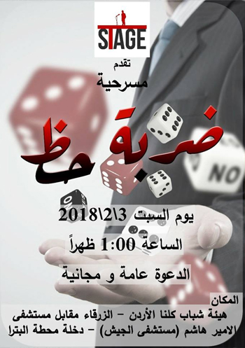 تدعوكم مؤسسة خشبة المسرح للتدريب والتنمية Stage TP لحضور مسرحية “ضربة حظ” التي سيتم عرضها في هيئة شباب كلنا الاردن – الزرقاء (مقابل مستشفى الامير هاشم/دخلة محطة البترا)