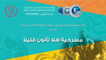 ضمن فعاليات أيام مؤسسة عبد الحميد شومان الثقافية في الكرك، نقدم لكم مسرحية “هلا تأتون قليلاً” للمخرج بلال زيتون، وذلك يوم الجمعة 21/4/2017 الساعة 7:30 مساءً على مسرح مركز الحسن الثقافي.