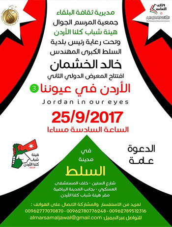 معرض الأردن في عيوننا الدولي والذي تقيمه جمعية المرسم الجوال أفتتح في المركز الثقافي الملكي تحت رعاية وزير الثقافة الأردني نبيه شقم بتاريخ10/7/2017 ومن ثم انتقل إلى الزرقاء بتاريخ 28/8/2017 تحت نفس الرعاية وها هو اليوم يحط رحاله في مدينة السلط العريقة وفي مقر هيئة شباب كلنا الأردن تحت رعاية مديرية ثقافة البلقاء ورئيس بلدية السلط خالد الخشمان ..