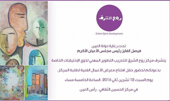 بدعوتكم لحضور حفل افتتاح معرض الأعمال الفنية لطلبة المركز ،يوم السبت 12 تشرين ثاني 2016 الساعة الخامسة مساء في مركز الحسين _ رأس العين .