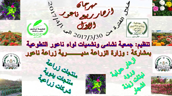 برعاية معالي وزير الزراعة سيتم باذن الله اقامة مهرجان ازهار ربيع ناعور وهو مهرجان يشارك فيه اكثر من 20 مشتل يتم فيه عرض مجموعة من الازهار الحولية ونباتات الزينة والورود والاشجار على مدار 3 ايام من 2017/3/31 في ناعور حي الشهيد
