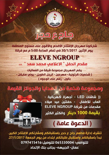 شاركونا مهرجان الافتتاح الأقوى على مستوى المنطقة لمطعم جاج ع حجر يوم الإثنين 30/1/2017