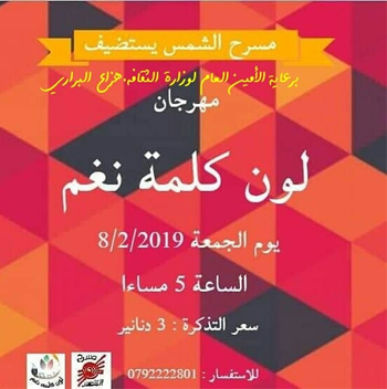 يستضيف مسرح الشمس مهرجان “لون كلمة نغم ” و هو مهرجان يضم العديد من الأنشطة الثقافية : معرض للاعمال الفنية و التشكيلية , شعراء , عازفين ..