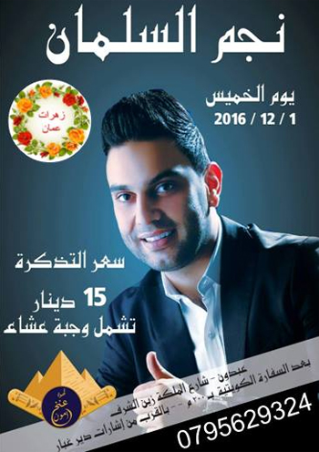 وتستمر مفاجات زهرات عمان الخميس 12/1 موعدنا مع أمسية زهرات عمان للعائلات والفنان نجم السلمان بمطعم عنخ امون بادارته الجديده عبدون اشارات دير غبار مع عشاء فاخر ومشروب غازي وأكيد مع زهرات عمان لازم هدية لكل تذكرة