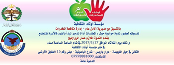 مؤسسة أوتاد الثقافية تدعوكم لحضور ندوة حوارية حول المخدارت ” المخدارات أداة تدمير تبدأ بالفرد فالأسرة فالمجتمع ” بالتنسيق مع مديرية الأمن العام – إدارة مكافحة المخدرات و ذلك يوم الثلاثاء الموافق 17/1/2017