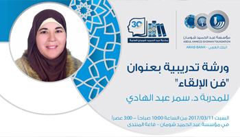 تُقيم مكتبة عبد الحميد شومان يوم السبت الموافق 11/3/2017، من الساعة 10 صباحاً – 3 عصراً ورشة تدريبية بعنوان “فن الإلقاء” للمدربة د. سمر عبد الهادي، وذلك في قاعة منتدى مؤسسة عبد الحميد شومان.