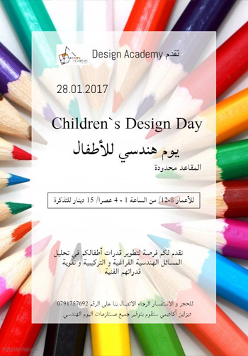 يوم هندسي للأطفالكم، ملئ بالتمارين الهندسية الممتعة، المطورة للقدرة التحليلية في فهم الفراغات و تراكب الكتل بالاضافة الى تقوية الذاكرة. سيقوم أطفالكم و على شكل مجموعات في حل عدد من التمارين و التي تشرف عليها عدد من المهندسات المتخصصات في المجالين الاكاديمي و العملي، و بطريقة لا تخلو من المتعة و اللعب و الاستمتاع. يمكنكم التواصل مع ديزاين أكاديمي في أية وقت للمزيد من المعلومات و التفاصيل عن الفعالية.