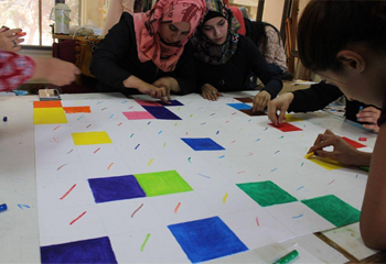 يتحدث جهاد العامري، رئيس قسم الفنون البصريّة في كليّة الفنون الجميلة بالجامعة الأردنيّة، مع طلاب الجامعة الأردنيّة حول تنفيذ تعليمات “do it بالعربي” من عامر نور، عادل عابدين، إتيل عدنان وزياد عنتر خلال فترة الصيف