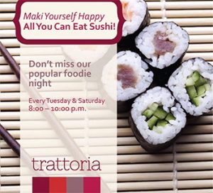 All You can Eat Sushi @ Trattoria Every Tuesday & Saturday - 8pm - 10pm A reminder for you, that it's ALL YOU CAN EAT SUSH! For more information call on: 0797711177