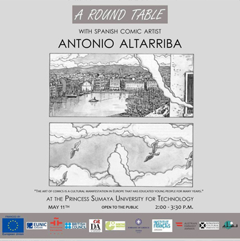 With the support of the European Union and EUNIC Jordan, and in Collaboration with Instituto Cervantes, F.A.D.A. 317 will be holding a round table talk with Spanish Comics Writer and Novalist Antonio Altarrbia on May 11th 2017.