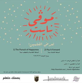 كونوا معنا بيوم مليء بالمتعة لمشاهدة فيلمين رائعين: فيلم Pursuit of Happyness و Pay it Forward يوم السبت الموافق 16/12 في فندق لاندمارك عمان