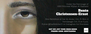 Danish Painter Bente Christensen-Ernst is holding her first-ever exhibition in Jordan. With a new collection in her signature sytlized realism method, Bente’s exhibition is sure to be one of our most memorable yet.