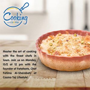 Cooking Session: Chef Fatima Al-Sharabati @ Cozmo, Taj Mall on Monday 13/2/2017 - at 12 pm Chef Fatima is back at Cozmo Kitchen to teach us how to make the perfect Um Ali & her very own special pizza recipe! …