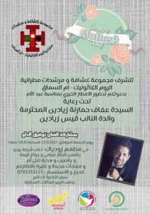 تحت رعاية السيدة عفاف حمارنة زيادين المحترمة والدة النائب قيس زيادين تتشرف مجموعة كشافة ومرشدات مطرانية الروم الكاثوليك أم السماق بدعوتكم لحضور حفل الافطار الخيري بمناسبة عيد الام بتاريخ 17\3\2017 الساعة 10:30 صباحا في مطعم زودياك بمشاركة الفنان توفيق الدلو …